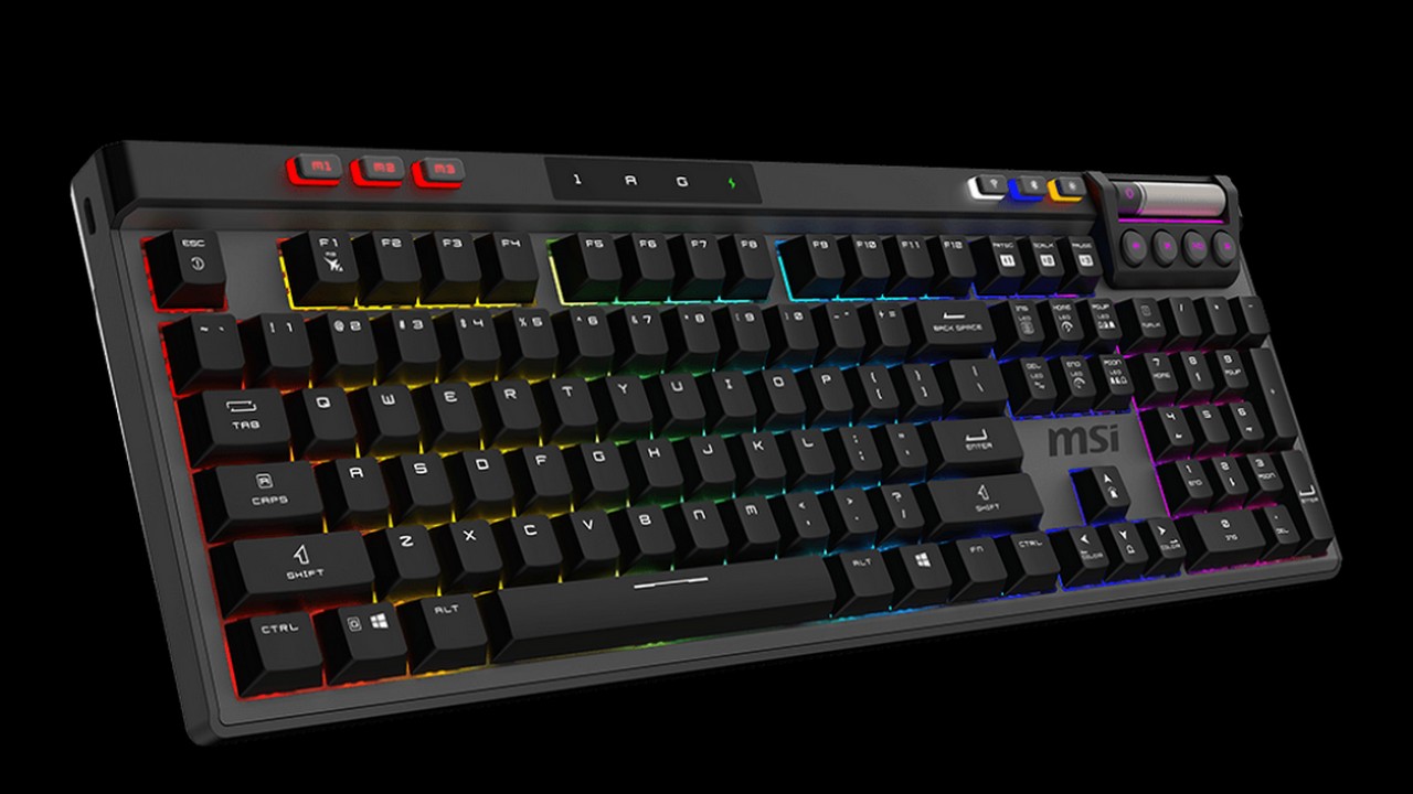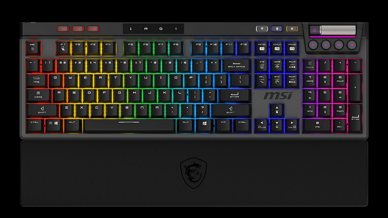 MSI wyposażyło klawiaturę w obrotowe pokrętło do regulacji głośności – działa świetnie i jest bardzo wygodne w codziennym użytkowaniu. Można nim też sterować jasnością podświetlenia RGB. Niestety, znajdujące się obok przyciski multimedialne to zupełnie inna historia. Są tandetne, trzeszczą i wyraźnie odstają jakością od reszty klawiatury. W sprzęcie za ponad 600 złotych to niedopuszczalne.